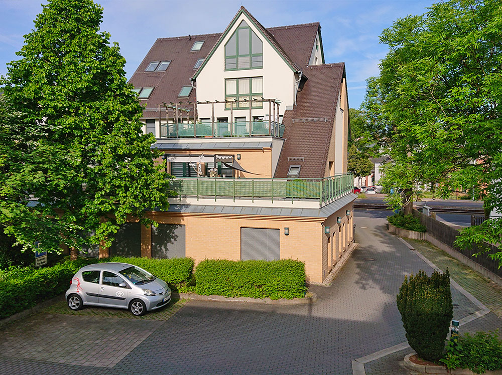 Gebäuderückseite mit Parkplätzen